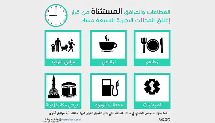 وأكد وزير العمل أن التوصية التي تم رفعها لا تشمل إغلاق المطاعم والمقاهي، ومرافق الترفيه أو الاحتياجات الضرورية كالصيدليات ومحطات الوقود، إضافة إلى استثناء مدينتي مكة المكرمة والمدينة المنورة لخصوصيتهما، كما تُستثنى أي مرافق أخرى يستثنيها المجلس البلدي في ذات المنطقة التي يتم تطبيق القرار فيها في حال إقراره.