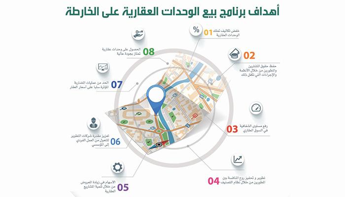 وأبانت أن برنامج البيع على الخارطة يهدف إلى الإسهام في تعزيز الثقة بالسوق العقارية، وتحفيز أنشطة التطوير العقاري المتنوعة، وتوفير قنوات دعم وتمويل مشاريعها عبر رفع مستوى الشفافية في السوق العقاري ،كما يؤكد على توفير ضمانات كافية لحفظ حقوق المشترين للعقار من خلال متابعة الوزارة المستمرة للمشاريع المرخصة وبشكل دائم، إضافة إلى مساهمته في تخفيض تكلفة تملك الوحدات العقارية.