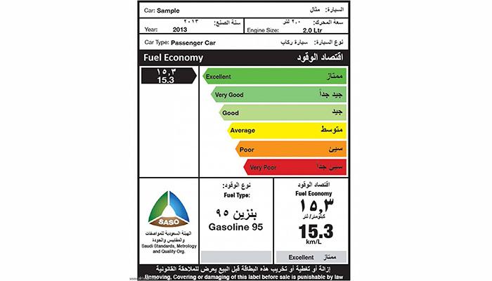 وتظهر البطاقة التي أعدها المركز السعودي لكفاءة الطاقة بمدينة الملك عبدالعزيز للعلوم والتقنية بالتعاون مع الهيئة السعودية للمواصفات والمقاييس للمستهلك مدى استهلاك الطاقة لكل طراز من المركبات، حيث تم تصنيف قيم اقتصاد الوقود إلى ستة مستويات "ممتاز، جيد جدًا، جيد، متوسط، سيء، سيء جدًا".