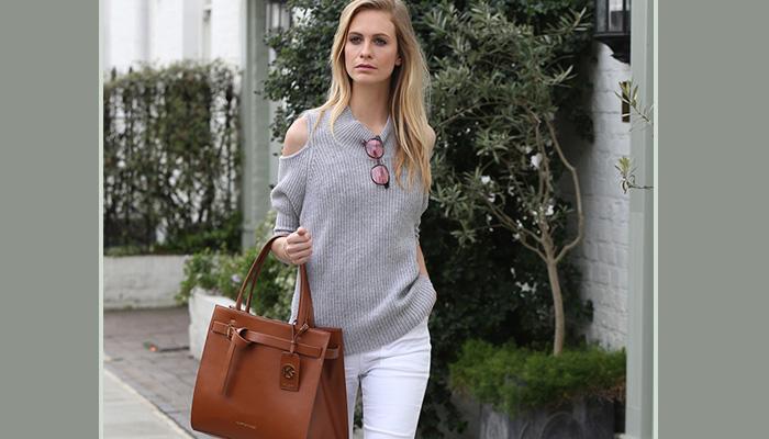 واستكملت النجمة الإنجليزية جمال إطلالتها البريئة بالأبيض والرمادي بحقيبة Victoria belted tote بلون الجلد الأسمر من كيرت جيجر.