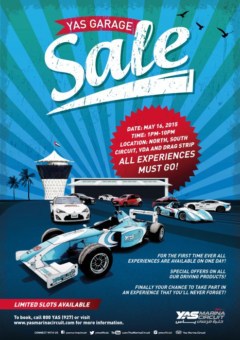 تتيح الحملة لمحبي السرعة فرصة اختبار مجموعة واسعة من تجارب القيادة في حلبة مرسى ياس خلال يوم واحد تنظم حلبة مرسى ياس خلال يوم السبت القادم يوماً حافلاً بالتشويق والسرعة التي تمتع جميع أفراد العائلة. حيث تتيح الحلبة لزوارها فرصة اختبار المجموعة الواسعة من تجارب القيادة والركوب المثيرة التي توفرها الحلبة خلال يوم واحد، في فرصة فريدة من نوعها لا يمكن تفويتها تقدمها حلبة مرسى ياس لأول مرة. وتطلق حلبة مرسى ياس هذه الحملة تحت عنوان "يوم ياس لتجارب القيادة"، والتي تعد أحدث الإضافات لجدول الفعاليات الترفيهية وتجارب القيادة التي تنظمها حلبة مرسى ياس على مدار العام، الأمر الذي يعني أنه هناك دائماً أمر جديد لاختباره في حلبة مرسى ياس لزوار الحلبة من جميع الأعمار. ويمكن للزوار الحضور للحلبة وحجز أي تجربة قيادة من المجموعة الواسعة التي تقدمها حلبة مرسى ياس. وتعد هذه فرصة مثالية للأصدقاء والعائلات للجلوس خلف عجلة القيادة واختبار المجموعة الواسعة من تجارب القيادة والركوب التي تقدمها حلبة مرسى ياس والتي تتضمن قيادة سيارة أستون مارتن جي تي 4 واختبار قوة محركها وقيادتها السلسلة على منعطفات الحلبة، وقيادة سيارة فورمولا 3000 والتي تتمتع بمحرك من ستة أسطوانات بسعة 3 ليتر، طورته شركة كوزوورث المعروفة بتصاميمها عالية الأداء والمخصصة لسيارات الفورمولا 1 خصيصاً لحلبة مرسى ياس، كما يمكن للأصدقاء مواجهة بعضهم البعض في سلسلة سباقات الدريفت، أو يمكن الانطلاق في سباقات الكارتينج على مسار الحلبة التي تستضيف جائزة أبوظبي لسباقات الفورمولا 1. وتقدم حلبة مرسى ياس خصومات على مجموعة متنوعة من التجارب عند حجزها، وتزداد قيمة الخصم مع حجز المزيد من التجارب، كما تقدم خصومات على العديد من التجارب، والتي تتضمن حسومات بنسبة 20% لكل من تجربتي ياس دريفت سبرينت وشيفروليه كامارو دراج، وحسماً بنسبة 10% على تجربة ياس راديكال إس إس تي بالإضافة إلى العديد من العروض المميزة الأخرى. وتعد حملة "يوم ياس لتجارب القيادة" تحولاً جذريا في الأسلوب الذي تتبعه حلبة مرسى ياس في تقديم مجموعتها الواسعة والمتنوعة من تجارب القيادة والركوب لزوارها، وتخطط الحلبة لتقديم المزيد من العروض المشابهة خلال الفترة القادمة. ويمكن لمحبي السرعة والإثارة زيارة الحلبة بدءاً من الساعة الواحدة ظهراً لحجز أي تجربة قيادة يرغبون بها، أو يمكن التواصل مع الحلبة على الرقم 800927 أو 97126299800 أو زيارة الموقع http://www.yasmarinacircuit.com/en/experiences/yas-garage-sale