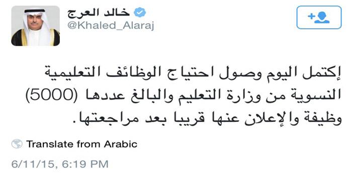 أوضح وزير الخدمة المدنية خالد العرج عبر حسابه الشخصي في موقع التواصل الاجتماعي «تويتر» أن الوزارة وصلها احتياج الوظائف التعليمية النسوية من وزارة التعليم والبالغ عددها 5 آلاف وظيفة. وأشار وزير الخدمة المدنية إلى أنه سيتم الإعلان عن الوظائف قريبا بعد مراجعتها.