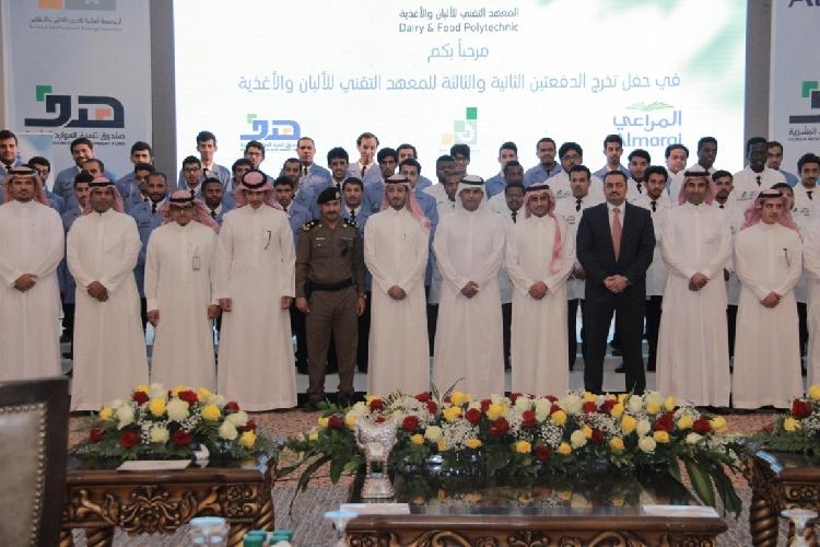 تحت رعاية معالي وزير العمل الدكتور مفرج الحقباني، وبحضور الدكتور عبدالعزيز العمرو نائب الرئيس للشراكات الاستراتيجية في كليات التميز، اقيم حفل تخريج الدفعتين الثانية والثالثة من طلبة المعهد التقني للألبان والأغذية بمحافظة الخرج، والبالغ عددهم 71 خريجاً من ثلاث تخصصات رئيسية هي إنتاج الألبان والأغذية وصيانة معدات الإنتاج والإنتاج الحيواني.