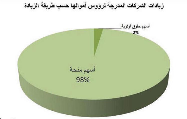 ووفقا لتحليل وحدة التقارير الاقتصادية في صحيفة "الاقتصادية"، فقد بلغ إجمالي زيادات رؤوس أموال الـ26 شركة، نحو 75.4 مليار ريال، 98 في المائة منها عبر طرح أسهم منحة بقيمة 73.6 مليار ريال، و2 في المائة عن طريق أسهم حقوق أولوية بقيمة 1.8 مليار ريال.