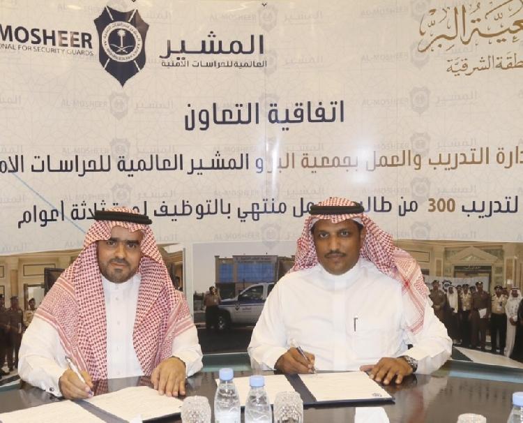 أبرمت مجموعة المشير العالمية للحراسات الأمنية اتفاقية تعاون مع ادارة التدريب والعمل بجمعية البر بالمنطقة الشرقية تقضي بتدريب وتاهيل٣٠٠ فرد من أيتام ومستفيدي خدمات الجمعية لدى مجموعة المشير منتهيه بالتوظيف وذلك لمدة ثلاث سنوات ، حيث جرت مراسم التوقيع بمقر الجمعية بالدمام ، وقد مثل مجموعة المشير رئيس مجلس الادارة الاستاذ فهد محمد القرني بينما مثل جمعية البر امين عام الجمعية الاستاذ سمير بن عبدالعزيز العفيصان وبحضور مدير ادارة التدريب والعمل بالجمعية عبداللطيف بن علي المحويتي .