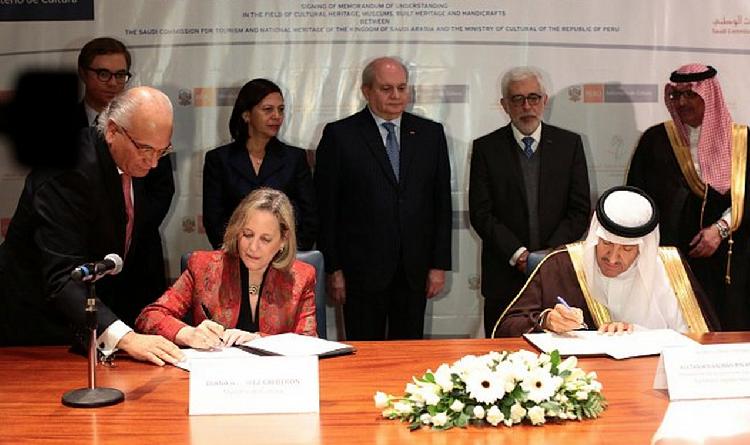 وقعت المملكة العربية السعودية وجمهورية البيرو مذكرة تفاهم في مجال التراث الحضاري شاملا التعاون في مجالات الآثار والمتاحف، والتراث العمراني، والحرف والصناعات اليدوية، والفعاليات الثقافية، والتطوير الاقتصادي والفني.