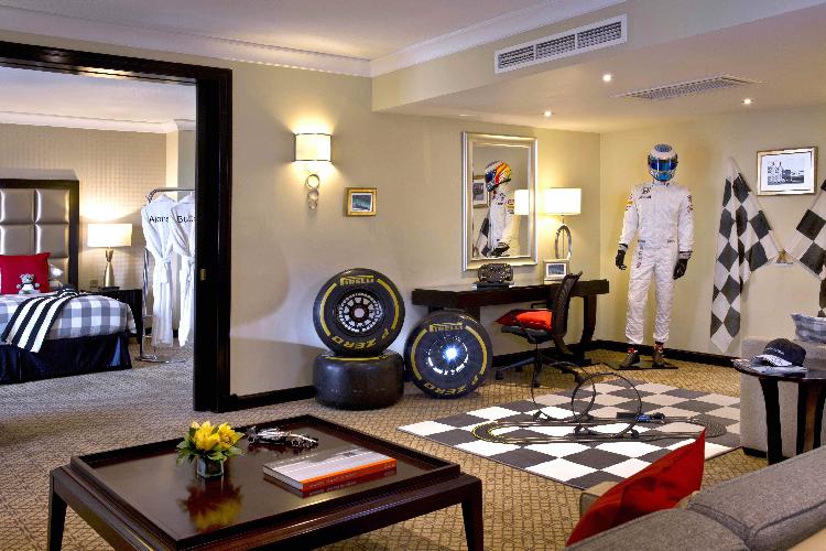 كما تم تجميع تشكيلة من مجسمات السيارات المصغرة التي ستسعد الكبار قبل الصغار أثناء الإقامة، في حين تم تجهيز الغرفة بأكملها بديكورات مرتبطة بعالم السباقات، من نموذج للسيارة وحتى الوسائد.