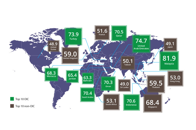 وقد سجلت دولة الإمارات 74.7 نقطة لتحل في المركز الثاني في القائمة الموحدة للمؤشر، في حين سجلت ماليزيا التي حلت في المرتبة الأولى 81.9 نقطة، وتلتها تركيا في المرتبة الثالثة برصيد 73.9 نقطة. وبالمقابل، جاءت سنغافورة في المرتبة الأولى للدول غير الأعضاء في منظمة التعاون الإسلامي، مسجلةً 68.4 نقطة، في حين جاءت تايلند في المركز الثاني محققة 59.5 نقطة.