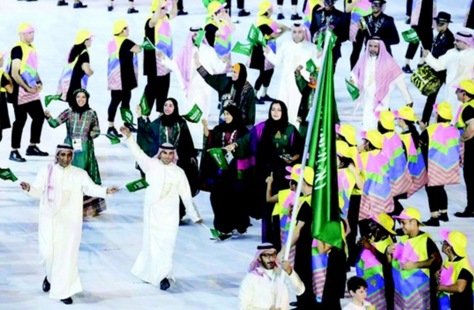 حمل لاعب المنتخب السعودي للجودو سليمان الحماد علم المملكة العربية السعودية خلال مسيرة الوفد السعودي حفل افتتاح الأولمبياد صباح أمس السبت، بمشاركة الرباع محسن الدحيلب واللاعبات كاريمان أبو الجدايل ولبنى العمير وجود فهمي وسارة عطار واللاتي تم تصميم ملابسهن من قبل مركز فن التراث ونال إعجاب المتابعين كما شارك في العرض عدد من إداريي الوفد.