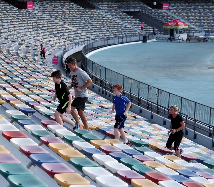 مجموعة من المشاركين في فعالية "تدرّب في مدينة زايد الرياضية" يصعدون أدراج الأستاد الرياضي في المدينة، حيث صعد المشاركون منذ اطلاق الفعالية في أبريل الماضي مسافة تعادل صعود 786,371 متر، أي ما يقارب تسلق قمة جبل إيفرست 21 مرة. تقام هذه الفعالية برعاية الشركة الوطنية للضمان الصحي – ضمان مساء الخميس الأخير من كل شهر ما بين الساعة 6 – 9 مساءً.