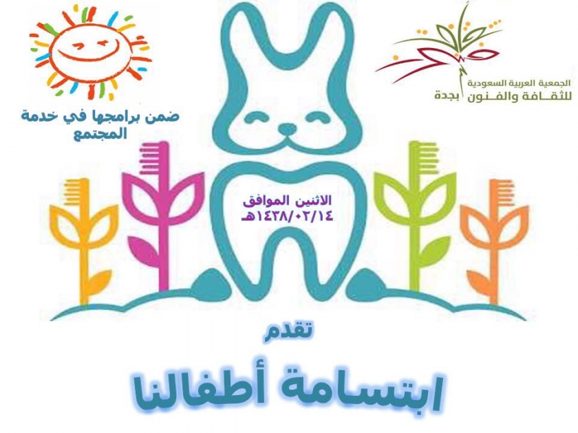 تحتضن جمعية العربية للثقافة والفنون بجدة فعالية ابتسامة اطفالنا حيث تهدف الى توعية الاطفال بكيفية استخدام الفرشاة والمعجون واستخدام مادة الفلوريدا بالتعاون مع طلاب وطالبات كلية الاسنان بجدة والتي تستهدف مجموعة من ايتام جدة