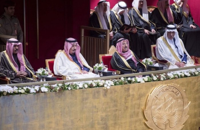 وبعد أن أخذ خادم الحرمين الشريفين وسمو أمير دولة الكويت مكانهما في المنصة الرئيسة عزف السلام الملكي السعودي والوطني الكويتي.