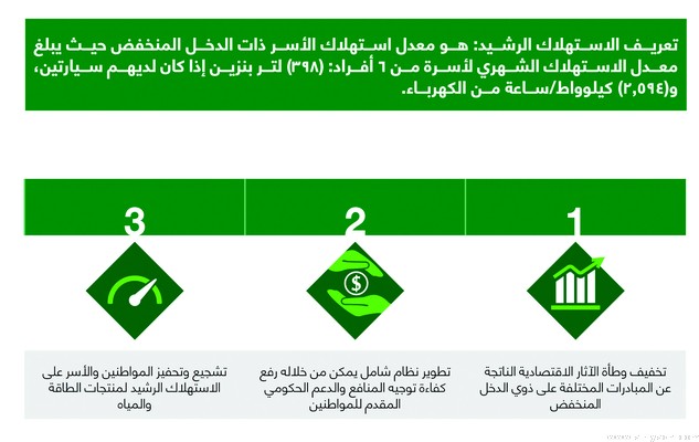 تعريف الاستهلاك الرشيد هو معدل استهلاك الأسر ذات الدخل المنخفض حيث يبلغ معدل الاستهلاك الشهري لأسرة من 6 أفرد 398 لتر بنزين إذا كان لديهم سيارتين و2594 كيلو واط في الساعة من الكهرباء.