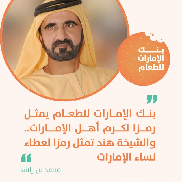 وأشار صاحب السمو الشيخ محمد بن راشد آل مكتوم إلى أن " رئاسة سمو الشيخة هند بنت مكتوم لبنك الإمارات للطعام هو ضمانة لتحقيق توقعاتنا العالية من هذه المؤسسة الإنسانية الجديدة" مضيفا سموه " بأن الشيخة هند أقرب الناس للناس .. ومحبتها الدائمة لعمل الخير يجعلها الأنسب لقيادة هذا المشروع الجديد" لأن توجيهاتنا للبنك هي بإشراك أكبر عدد من الفعاليات المجتمعية ومن المتطوعين في هذه المنظومة الإنسانية الجديدة