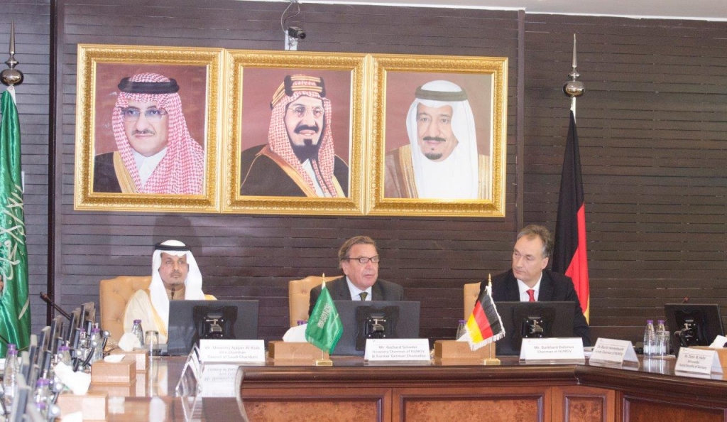 من جهته قال دولة مستشار ألمانيا السابق والرئيس الفخري للجمعية الألمانية للشرق الأدنى والأوسط السيد جيرهارد شرويدر أن زيارته للمملكة على رأس وفد تجاري يضم العديد من الشركات الالمانية تأتي في سياق تعزيز علاقات ألمانيا مع المملكة ومناقشة أجندة التعاون الاقتصادي بين البلدين، ووصف المملكة بأنها شريك هام لبلاده على مختلف الأصعدة وقال إن التحديات الاقتصادية الإقليمية والدولية تتطلب مزيد من التنسيق والتعاون بين البلدين ولفت لرؤية المملكة 2030 وما تتضمنه من فرص واسعة لتوثيق الشراكة الاستثمارية والتجارية بين قطاعي الاعمال السعودي والألماني معرباً عن استعداد ألمانيا ورغبتها للمشاركة في تحقيق توجهات رؤية 2030 وبرنامج التحول الوطني بما يتوافر لدى الشركات الألمانية من خبرات وقدرات وتقنيات متميزة في العديد من المجالات كالطاقة المتجددة والمياه والقطاع الصحي وغيرها من المجالات الأخرى ذات العلاقة بالرؤية.