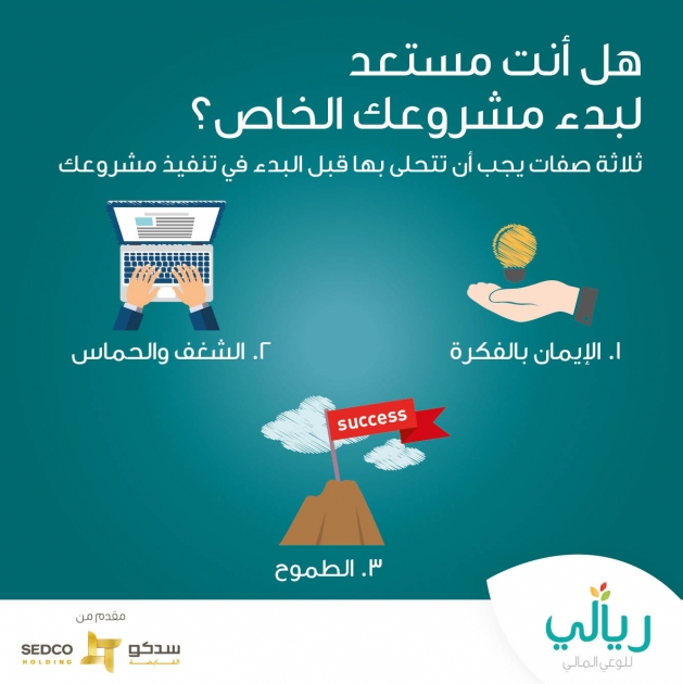 ويقول السيد/ عبدالرحمن الترجمـان – مدير برنامج ريالي لرواد الأعمال: "هناك ثلاثة صفات يجب أن يتحلى بها المستثمر أو رائد الأعمال قبل البدء في تنفيذ مشروعه الخاص. الصفة الأولى هي إيمانه بالفكرة والتي من غيرها سيظل المشروع حبيس الأوراق. والصفة الثانية الشغف والحماس وهي الصفة الأهم في إنزال المشروع الى أرض الواقع. وأخيرا الطموح وهي من أهم صفات رجال/سيدات الأعمال الذين لا يكتفون بما تحقق من نجاح بل يتطلعون نحو آفاق أرحب ويكون لديهم الاستعداد التام لخوض غمار التحديات وبالتالي تحقيق مزيداً من النجاحات وتوسيع المشروع".