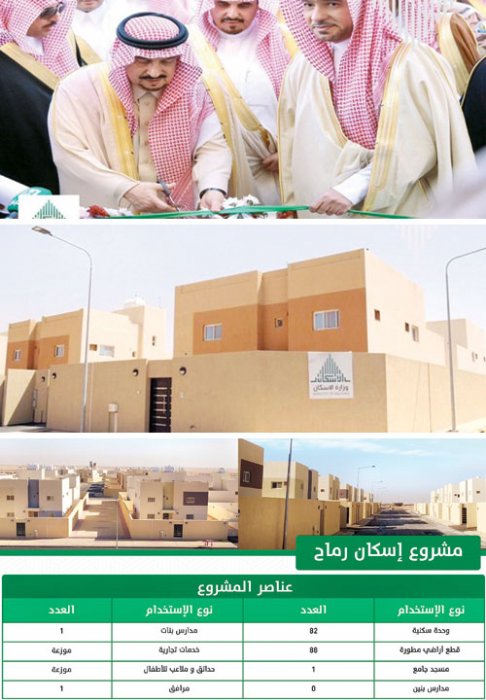 باكورة هذه المشاريع مشروع إسكان رماح الذي دشنه صاحب السمو الملكي الأمير فيصل بن بندر بن عبدالعزيز أمير منطقة الرياض، بحضور معالي وزير الإسكان الأستاذ ماجد بن عبدالله الحقيل، والذي شمل 82 وحدة سكنية و88 قطعة أرض سكنية مكتملة البنى التحتية و23 قطعة أرض تجارية على مساحة 209.787 مترًا مربعًا، بقيمة إجمالية بلغت 90.833.670 ريالاً.