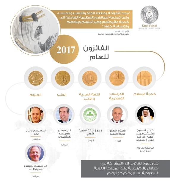 وقام الملك سلمان بن عبدالعزيز بتكريم أربع باحثين ومؤسسة علمية على إنجازاتهم العلمية وجهودهم لخدمة وتطوير البشرية في مجالات الدراسات الإسلامية، واللغة العربية والأدب، والطب، والعلوم. وجرت مراسم تسليم الجوائز بقاعة الأمير سلطان الكبرى بفندق الفيصلية بالرياض .