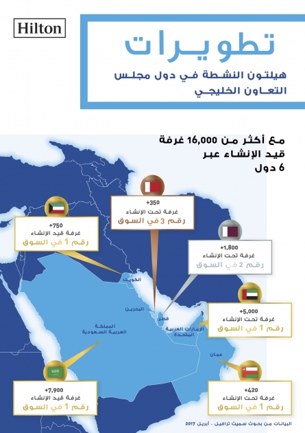 تمتلك مجموعة هيلتون أكثر من ٢١ ألف غرفة ضمن الخطط التوسعة المستقبلية بمنطقة الخليج العربي، أكثر من ١٦ ألف منها قيد الإنشاء، ومن المقرر افتتاحها قبيل عام ٢٠٢٠. وتستحوذ دول الخليج العربي على ثلث الغرف قيد الانشاء من مجموع مشاريع هيلتون الممتدة في أكثر من ٦٠ دولة في أنحاء أوروبا والشرق الأوسط وأفريقيا.