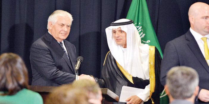 أكد معالي وزير الخارجية الدكتورعادل بن أحمد الجبير أن زيارة فخامة الرئيس دونالد ترمب رئيس الولايات المتحدة الأمريكية إلى المملكة العربية السعودية هي بداية لبناء حقبة جديدة في العلاقات الثنائية، وتعزيز لأواصر التعاون بين البلدين والعالم العربي والإسلامي. وأشار معاليه خلال المؤتمر الصحفي الذي عقده مع نظيره الأمريكي ريكس تيلرسون في العاصمة الرياض امس، إلى أن اتفاقيات الشراكة الاستراتيجية التي وقعها خادم الحرمين الشريفين الملك سلمان بن عبدالعزيز آل سعود ـ حفظه الله ـ مع فخامة الرئيس دونالد ترمب رئيس الولايات المتحدة الأمريكية ستتطور إلى شراكة استراتيجية قوية. وأبان معالي وزير الخارجية أنه سيتم التعامل مع التطرف والإرهاب بالعديد من الطرق الكثيرة التي سيتابع من خلالها سبل مكافحتها، بالإضافة إلى زيادة القدرات الدفاعية والتصميم على التعاون الدفاعي المشترك، واصفاً الزيارة بالتاريخية التي تفتح أواصر التعاون المشترك بين البلدين في مجالات التجارة والاستثمار والتعليم، إلى جانب العمل على المضي في تعزيز المصالح المشتركة والتعاون مع التحديات التي تواجه البلدين. وقال معالي الدكتور الجبير :» إن هذا أمر غير مسبوق، فلم نوقع من قبل مثل هذه الاتفاقيات بين رئيسي البلدين لتعزيز الشراكة الإستراتيجية، ونود أن نمضي قدما في هذه الشراكة، حيث وقع البلدان مجموعة من الاتفاقيات سواء تجارية بين الحكومتين، ويشمل ذلك استثمارات تجارية وفي البنية التحتية والتقنية والدفاع والمبيعات الخاصة بالاستثمارات السعودية، وكذلك الاستثمارات الأمريكية في المملكة»، مبيناً أن قيمة العقود الموقعة تجاوزت 380 مليار دولار على مدى عشر سنوات قادمة، وستعمل على توفير الكثير من الفرص بين المملكة والولايات المتحدة، وأضاف معاليه أن التحول التقني بين البلدين سيعزز من نماء الاقتصاد وزيادة فرص الاستثمارات الأمريكية في المملكة، كاشفاً عن أبرز المحادثات الموسعة التي أجراها خادم الحرمين الشريفين ـ حفظه الله ـ مع الرئيس ترمب التي من شأنها مواجهة التحديات، والحديث عن العلاقات الثنائية وسبل تحسينها في شتى المجالات، مشيراً إلى مناقشة خطر الإرهاب والتطرف وتمويل الجماعات الإرهابية، وطرق مواجهتها، والأعمال المختلفة التي يجب العمل عليها لمكافحة خطر الإرهاب والحد من الأنشطة الإيرانية، مؤكداً أن هناك قرارات تم اتخاذها لوقف تمويل إيران للإرهاب ولصواريخ العابرة للقارات ووقف انتهاك حقوق الإنسان الخاصة في إيران، إلى جانب وقف تدخلها في بلدان المنطقة. وأبان معالي وزير الخارجية أن خادم الحرمين الشريفين أعرب عن تفاؤل المملكة لوضع منهج جديد، والعزم في اتخاذ الإجراءات اللازمة لإنهاء الصراع القائم في سوريا، وكذلك إيجاد سلام دائم بين دولة فلسطين وإسرائيل، بالإضافة إلى مناقشة الوضع في اليمن والاستثمارات الخاصة بذلك، مشيراً إلى انعقاد قمة دول مجلس التعاون الخليجي والقمة العربية الإسلامية، التي تعد من القمم غير المسبوقة التي تجمع العالم الإسلامي والولايات المتحدة في شراكات مختلفة ومحادثات موسعة. ورفع معاليه الشكر والعرفان لخادم الحرمين الشريفين ولرئيس الولايات المتحدة على الخطوات التي أخذاها لتغيير سبل الحوار مع الولايات المتحدة الأمريكية وتغيير الوضع في الدول الإسلامية والعربية، ومن ثم زيارة الرئيس الأمريكي بعد ذلك لفلسطين والفاتيكان التي سيخاطب خلالها العالم المسيحي واليهودي للجمع بين الديانات الإبراهيمية معاً في بوتقة واحدة، لغرض الوصول إلى إنهاء الصراع الحضاري بين الأديان. وأعرب وزير الخارجية الأمريكي ريكس تيلرسون من جهته عن فخره للحديث عن تعزيز الشراكة الإستراتيجية بين المملكة والولايات المتحدة، مبيناً أن تلك اللحظة هي فارقة في تاريخ العلاقات بين البلدين، من شأنها تكريس الجهود لتحسين الشراكة الإستراتيجية في السنوات القادمة، وفتح سبل جديدة للسلام في الشرق الأوسط ودعم عملية التنمية الاقتصاد