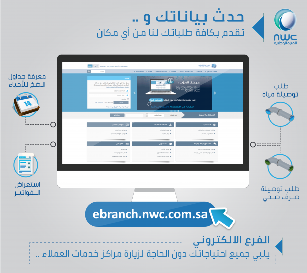 دعت شركة المياه الوطنية عملاءها بتحديث بياناتهم الخاصة باشتراكات قطاع خدمات المياه والصرف الصحي، وذلك من خلال فرعها الإلكتروني، أو زيارة أقرب فرع لخدمات العملاء في أربع مدن (الرياض، مكة المكرمة، جدة، الطائف)، أو التواصل مع مركز الاتصال الموحد للشركة رقم (920001744). وذلك لتفادي تراكم مديونيات المياه ولضمان استمرارية الخدمة.