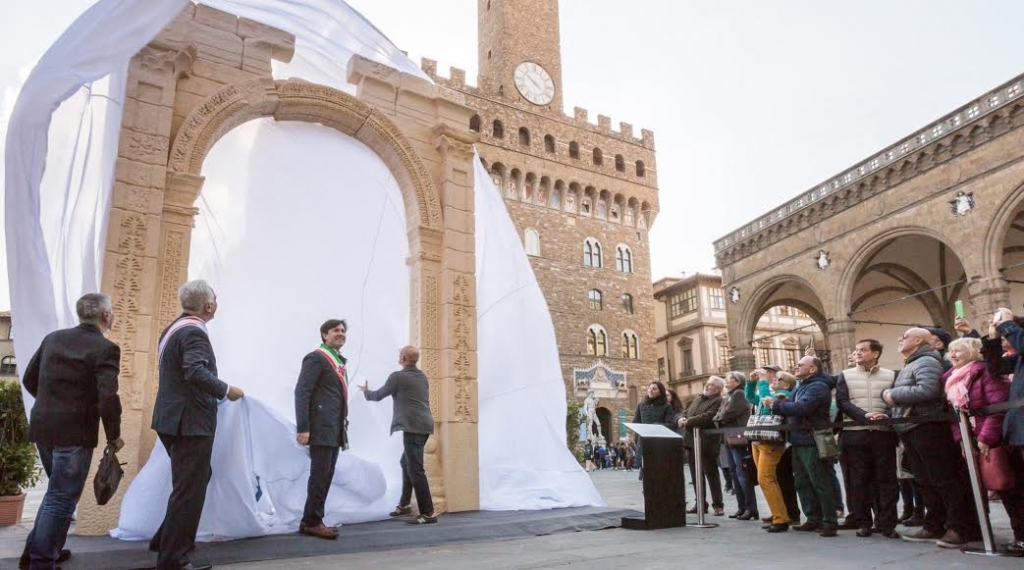 وكان وزير الثقافة الايطالي معالي داريو فرانچيسكيني يرافقه عدد من المسؤولين الحكوميين الكبار، بمن فيهم محافظ مدينة فلورنسا سعادة داريو نارديلا قد قاموا بأزاحة الستار عن نموذج قوس النصر ، والذي من المقرر أن يستمر عرضه في محطته الرابعة بعد لندن، ونيويورك ودبي حتى يوم 30 من شهر يوليو المقبل.