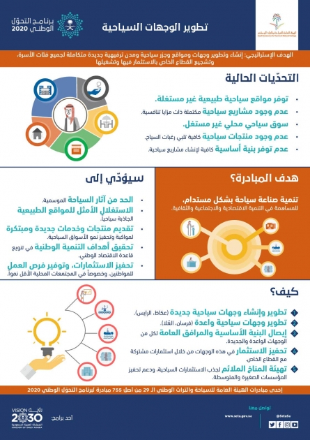 وتأتي مبادرات الهيئة العامة للسياحة والتراث الوطني الجديدة في سياق المرحلة الأولى من برنامج التحول الوطني 2020 التي يجري تنفيذها حالياً بالشراكة بين مجلس الشؤون الاقتصادية والتنمية و18 جهة حكومية وتتضمن 755 مبادرة في مختلف المجالات الاقتصادية والتنموية والاجتماعية، والتي ينتظر أن تسهم في تحول المملكة نحو العصر الرقمي، وتعزيز الشراكات بين القطاعين العام والخاص، وتوليد الوظائف، وتعظيم المحتوى المحلي.
