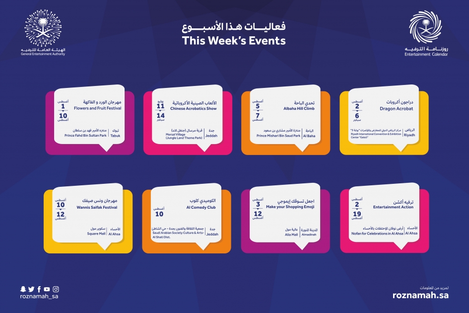 تجري حالياً مجموعة من الفعاليات الترفيهية المتنوعة والمدعومة من الهيئة العامة للترفيه حول المملكة وذلك ضمن فعاليات روزنامة الترفيه، حيث تستمر في الرياض فعالية "دراجون أكروبات" العالمية والتي لاقت حضوراً جماهيرياً عائلياً كثيفاً خلال الأيام الماضية وجمعت العديد من الأنشطة الاستثنائية مثل الأكروبات الروسي والأفريقي، والعرض العالمي للدراجات النارية، وألعاب الخفة، والعروض الهوائية والألعاب الأكروباتية الثلاثية. وتستمر بواقع عرضين يومياً حيث يبدأ العرض الأول الساعة 7 مساءً ويبدأ العرض الثاني الساعة 10 مساءً يومياً باستثناء أيام الأحد، وتستمر حتى 6 سبتمبر 2017م وذلك في مركز الرياض الدولي للمعارض والمؤتمرات.