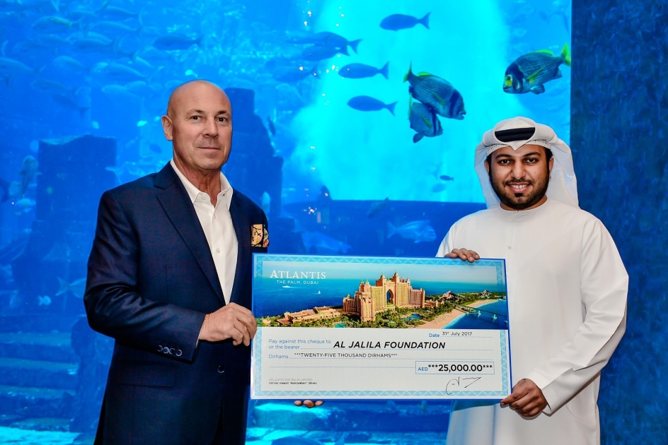 قام سيرج زالوف، الرئيس التنفيذي للعمليات لمنتجعات أتلانتس أند ريزيدنسيز، بالتبرع بمبلغ وقدره / 25,000 درهم / لمؤسسة الجليلة، تسلمها منه سليمان باهارون مدير إدارة تنمية الموارد المالية في مؤسسة "الجليلة، وذلك كجزء من التعاون المشترك بين المنتجع ومؤسسة الجليلة والذي تم تتويجه في شهر رمضان الماضي بالاتفاق على أن يتبرع منتجع أتلانتس النخلة بمبلغ مادي عن كل وجبة افطار وكل وجبة سحور تقدم في خيمة أساطير الرمضانية.