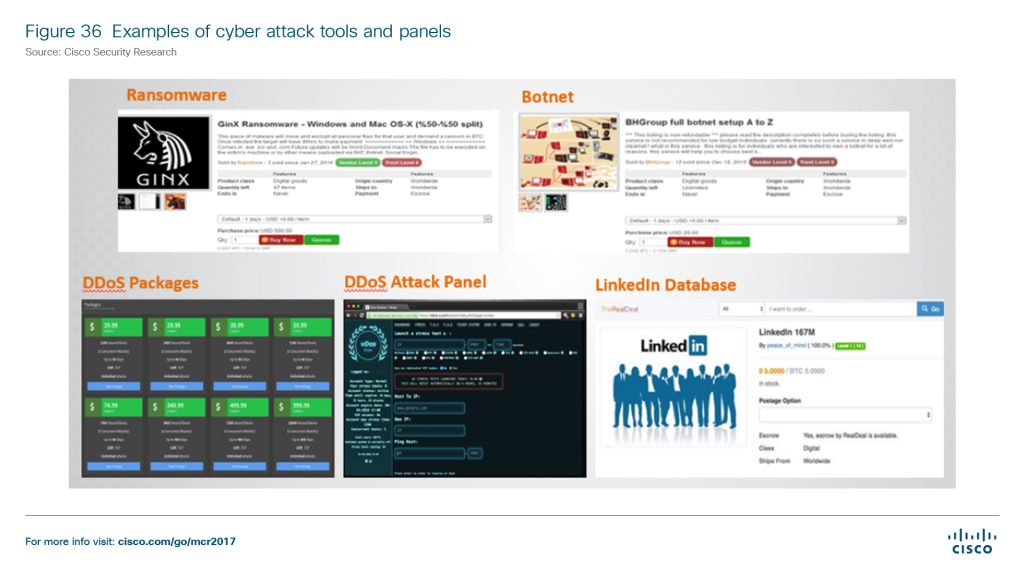 راقب الباحثون الأمنيون لدى سيسكو تطوّر البرمجيات الضارة خلال النصف الأول من العام 2017 وتعرّفوا إلى التغيرات الحاصلة في أسلوب المهاجمين في تنفيذ الهجمات والتشويش والمراوغة وتجنّب الكشف. كما لاحظت سيسكو بشكل خاص أن المهاجمين يطلبون من الضحايا بشكل متزايد تفعيل التهديدات عبر النقر على الروابط أو فتح الملفات، حيث أنهم يطورون برمجيات ضارة خالية من الملفات، تبقى في ذاكرة الجهاز ويكون من الأصعب الكشف عنها أو التحقق منها نظراً لأنها تُمسح عند إعادة تشغيل الجهاز. وأخيراً، يعتمد المهاجمون على بنية تحتية لا مركزية بلا هوية معروفة، ومنها خدمات Tor الوسيطة التي تمكنهم من السيطرة بشكل مخفي على الأوامر والأنشطة دون التعرف إلى هويتهم.