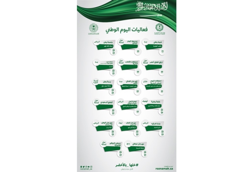 17 محافظة ومدينة ستشلمها فعاليات اليوم الوطني، وهي: "الرياض، وجدة، والدمام، والخبر، والجبيل، والمدينة المنورة، وأبها، ونجران، وجازان، وحفر الباطن، وعنيزة، وسكاكا، والهفوف، والدرعية، وحائل، وتبوك، وينبع".
