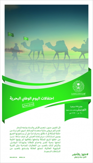 تطلق الهيئة العامة للترفيه ضمن احتفالاتها باليوم الوطني فعالية " احتفالات اليوم الوطني البحرية " وذلك يوم السبت المقبل 23 سبتمبر في الكورنيش مقابل منتزه سلوى بمنطقة جازان من الساعة 6 مساءً إلى الساعة 12:30 بعد منتصف الليل.