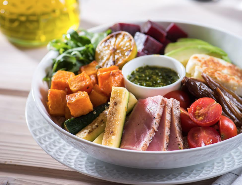 تبولة الكينوا، أفوكادو، جرجير، قرع جوزي محمّر، شمندر، كوسا، بصل، جبنة حلومي مشوية، طماطم كرزية وصلصة بيستو بالملفوف. يقدم الطبق مع ما تفضلونه من الدجاج المتبل بالزعتر أو الروبيان المتبل أو التونا الصفراء المسفوعة