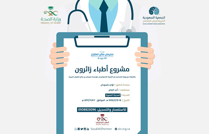 حيث ستكون محطة أطباء زائرون الثالثة في المدينة المنورة لتشخيص المرضى في المنطقة في مستشفى أحد العام يوم غد الثلاثاء وبعد غد الأربعاء 18-19 صفر 1439هـ الموافق 7-8 نوفمبر 2017م من الساعة الثامنة صباحاً وحتى الخامسة مساءً مع الطبيب لؤي باسودان استشاري، قسم طب الأسرة والعيادات الشاملة عضو اللجنة العلمية للجمعية كما سيتم إقامة محاضرة توعوية بعنوان "اسألني عن ألزهايمر" يوم الأربعاء تاريخ 19 صفر 1439هـ الموافق 8 أكتوبر 2017م في تمام الساعة السابعة والنصف مساءً في مستشفى أحد العام.