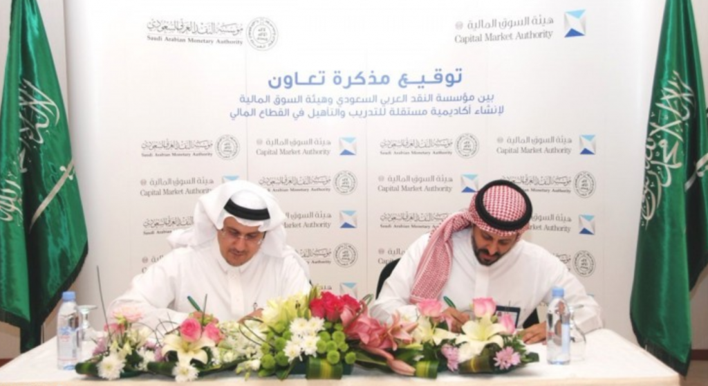 وقّع د.أحمد الخليفي، محافظ مؤسسة النقد العربي السعودي، محمد القويز رئيس مجلس هيئة السوق المالية مذكرة تعاون بين الجهتين للعمل على إنشاء أكاديمية مالية متخصصة في تدريب وتأهيل منسوبي القطاع المالي، في إطار التعاون المستمر بين مؤسسة النقد العربي السعودي وهيئة السوق المالية، وضمن مبادرات برنامج تطوير القطاع المالي أحد البرامج الرئيسة لرؤية المملكة 2030.