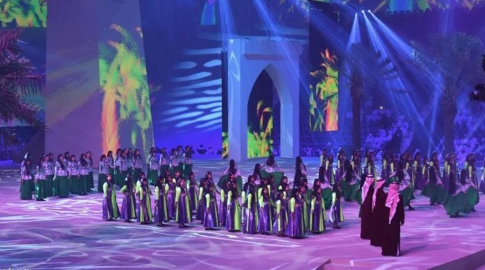 ثم شرف خادم الحرمين الشريفين الملك سلمان بن عبدالعزيز آل سعود - حفظه الله - وضيوف المملكة، الحفل الخطابي والفني الكبير الذي أقيم في القاعة المغلقة في الجنادرية.