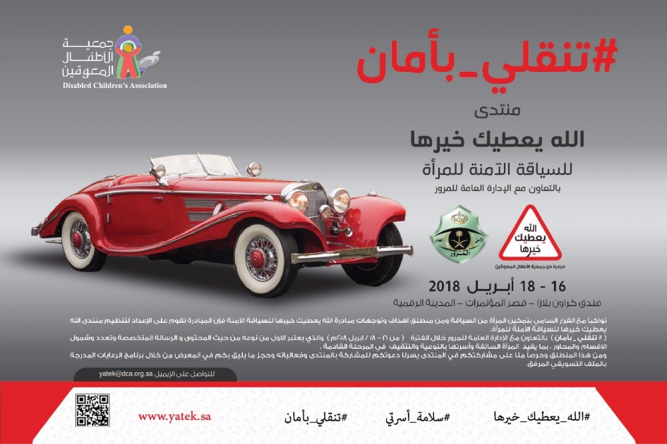 بدأ العد التنازلي لانطلاق فعاليات منتدى (#تنقلي_بأمان) والذي تنظمه المبادرة الوطنية (الله يعطيك خيرها) بالتعاون مع الإدارة العامة للمرور خلال الفترة من 30رجب إلى 2 شعبان 1439ه الموافق من 16- 18 أبريل الجاري ويحتضنه فندق كراون بلازا بمدينة الرياض.