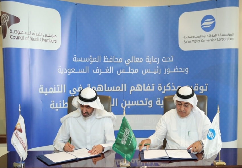 وقام بتوقيع مذكرة التفاهم كل من معالي محافظ المؤسسة العامة لتحليٍٍٍٍٍِـــة الميــاه المالحة المهندس علي بن عبد الرحمن الحازمي، ورئيس مجلس الغرف السعودية المهندس أحمد بن سليمان الراجحي، وذلك بالمقر الرئيس للمؤسسة العامة لتحلية المياه المالحة في الرياض.