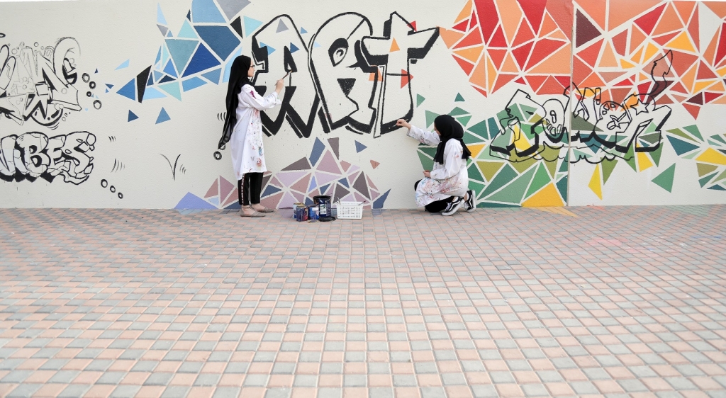 وسبق البدء برسم اللوحة الجدارية الفنية، ورشة عمل للفتيات تعرفن من خلالها على فن الجرافيتي باستعراض بعض اللوحات الجدارية لفنانين عالميين، كما تخلل العمل على اللوحة العديد من النقاشات وتبادل الآراء التي أسهمت في إثراء العمل الفني.