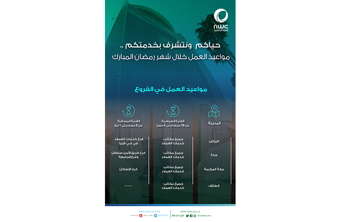 أعلنت شركة المياه الوطنية، أنها سوف تستقبل عملائها عبر مراكز خدمات العملاء بالشركة خلال شهر رمضان المبارك، على فترة واحدة (صباحية) من الساعة 10 صباحاً إلى 4 عصراً. كما خصصت أربعة فروع لخدمة العملاء في الفترة المسائية من الساعة (9 إلى 1 ليلاً)، وهي، فرع خدمات العملاء بحي شبرا في الرياض، وفرعي طريق الأمير سلطان وفرع الجامعة بجدة، وفرع حي الإسكان بمكة المكرمة.