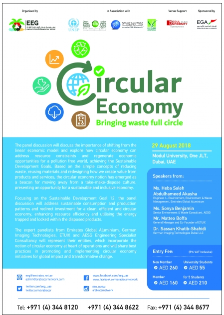 تنظم مجموعة عمل الإمارات للبيئية، يوم 29 اغسطس 2018، حلقة نقاشية في جامعة مودول دبي حول موضوع "الاقتصاد الدائري: الحلقة المكتملة للنفايات"، وذلك بالتعاون مع الشبكة العربية للمسؤولية الاجتماعية للمؤسسات ومجلس الإمارات للأبنية الخضراء ومجلس أعمال الطاقة النظيفة وبدعم استراتيجي من برنامج الأمم المتحدة للبيئة ( مكتب غرب اسيا).