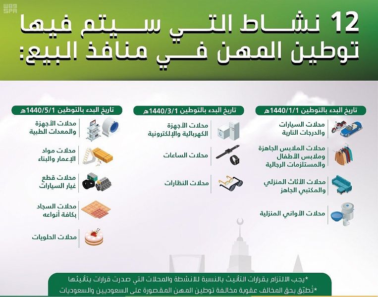 ومن المقرر أن يتم توطين منافذ البيع في أنشطة محلات الساعات، ومحلات النظارات، ومحلات الأجهزة الكهربائية والالكترونية، في تاريخ 01/03/1440هـ، بينما سيتم توطين منافذ البيع في أنشطة محلات الأجهزة والمعدات الطبية، ومحلات مواد الإعمار والبناء، ومحلات قطع غيار السيارات، ومحلات السجاد بكافة أنواعه، ومحلات الحلويات، في تاريخ 01/05/1440هـ.