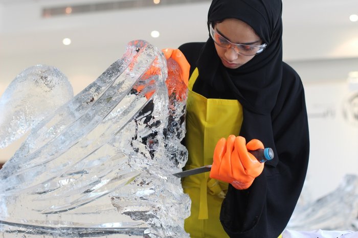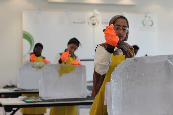 تبعتها ورشة "النحت على الجليد"، التي عرّفت 12 مرشدة متقدمة على أسرار النحت على الجليد، وتعرّفت الفتيات على مبادىء هذا الفن، وأنجزن منحوتاتهنّ بعد تقسيمهنّ إلى ست مجموعات، تتألف كل واحدة من مرشدتين، واستمتعت كل مجموعة بالنحت بعد تعلّم مرشداتها المهارات الرئيسة لشعوب الأسكيمو في النحت على الجليد.