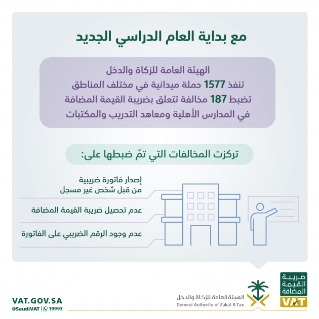ضبطت الهيئة العامة للزكاة والدخل187 مخالفة لضريبة القيمة المضافة خلال حملات ميدانية استهدفت المدارس الأهلية ومعاهد التدريب، ومحلات بيع القرطاسيات، والمكتبات، إضافةً إلى محلات بيع الزي المدرسي، وذلك بهدف التأكد من التزام هذه المنشآت بتطبيق نظام ضريبة القيمة المضافة.