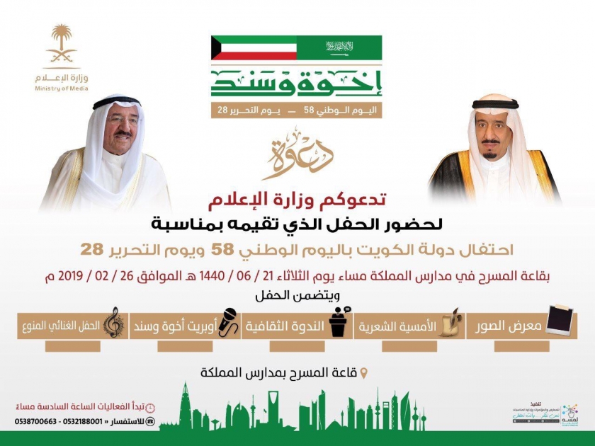 تنظم وزارة الإعلام تحت شعار أخوة وسند مساء يوم الثلاثاء الموافق ٢٦ فبراير ٢٠١٩ على مسرح مدارس المملكة ، فعاليات احتفالية متنوعة بمناسبة اليوم الوطني (٥٨) ويوم التحرير(٢٨) لدولة الكويت والذي يصادف الـ 25 من شهر فبراير الجاري.