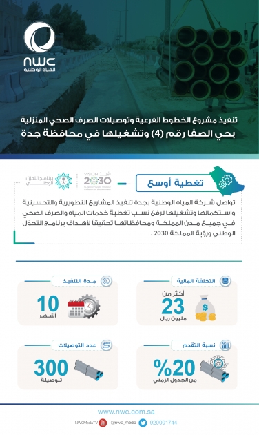أعلنت شركة المياه الوطنية، اكتمال أعمال تنفيذ مشروع خطوط فرعية وتوصيلات الصرف الصحي للعقارات بحي الصفا 4 بمحافظة جدة.