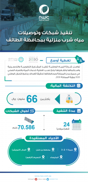 أنهت شركة المياه الوطنية تنفيذ أعمال شبكات مياه الشرب في (7) أحياء بمحافظة الطائف بتكلفة 66.12 مليون ريال. وأوضح المهندس محمد بن صالح الغامدي مدير عام المياه بمنطقة مكة المكرمة، أن المشروع يخدم أحياء جبرة 1 وجبرة 2 وجبرة 3 ومخطط بن فتن والجال (النويشر) والمليساء والنسيم (الزهور)، مبيناً أن أطوال الشبكة بلغت 70.586 كم، بواقع 2010 توصيلة عقار يستفيد منها 20100 نسمة.