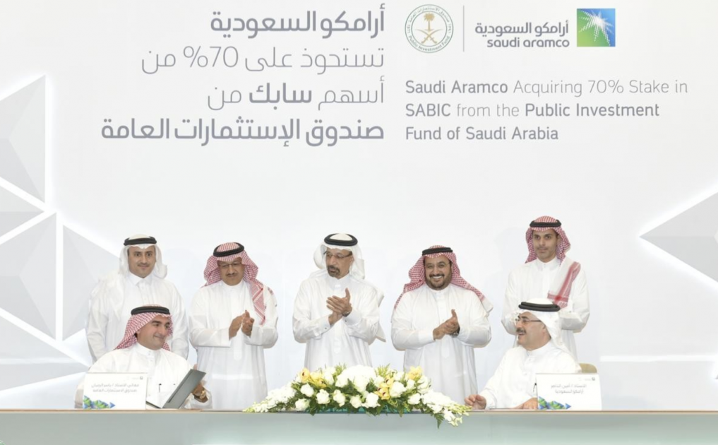 وقعت شركة "أرامكو السعودية" اتفاقية نهائية لشراء حصة صندوق الاستثمارات العامة في شركة "سابك" والبالغة 70 % من الشركة.