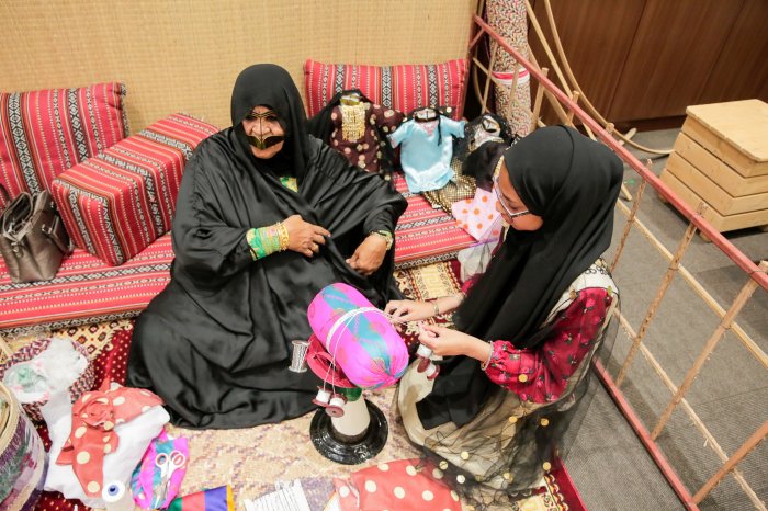 وكانت الحِرَف التقليدية المتصدرة في سماتها وصورها الجميلة من خلال تَلألُؤْ "التلي" بألوانه البراقة بكل أناقة، وأضافت "السفافة" جمالاً من نوع خاص على المشهد، كما تألقت حرفة "الحياكة" بشكل لافت، ونثرت "الحناء" بنقوشها المختلفة بزخارفها التراثية.