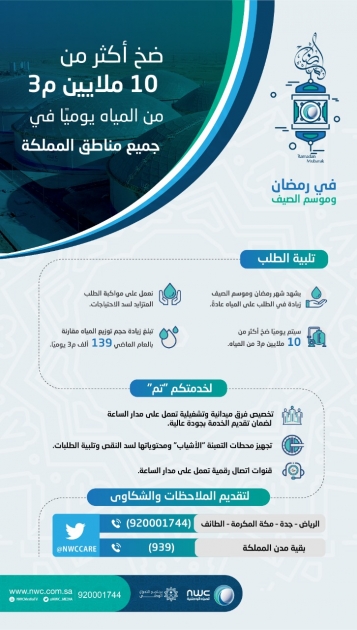 أكملت شركة المياه الوطنية استعداداتها لموسم شهر رمضان المبارك وموسم صيف العام الجاري، إذ ستضخ وتوزع خلال الفترة المقبلة نحو 10,106,384 ملايين يوميًا في جميع مناطق المملكة ومدنها، بهدف توفير أكبر كمية من المياه لأهالي وزوار المناطق خلال شهر رمضان والصيف، اللذان عادة ما يشهدان ارتفاعًا ملموسًا في الطلب على المياه.